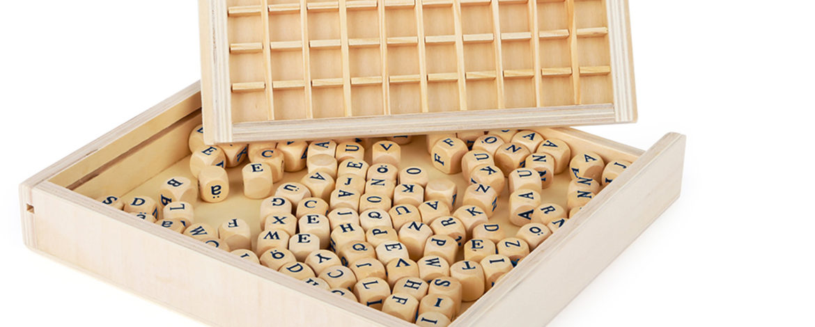 Com a placa embutida, os dados permanecem no sítio e não saem do lugar. Tudo pode ser guardado numa caixa de madeira e pode ser facilmente transportado. Este jogo incentiva o desenvolvimento de ortografia e o vocabulário.