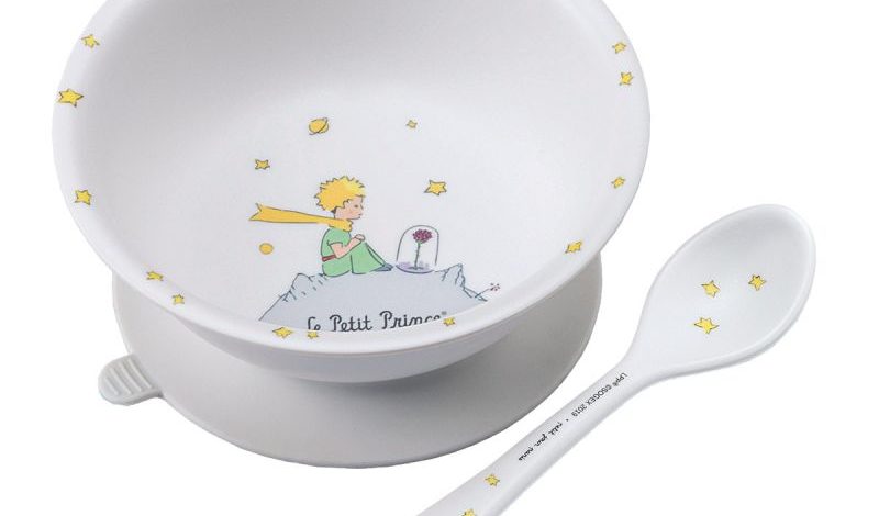 Uma ilustração de “O Principezinho” está no fundo da tigela e as bordas estão decoradas com estrelas. A colher também tem ilustrações alusivas ao tema “O Principezinho”.